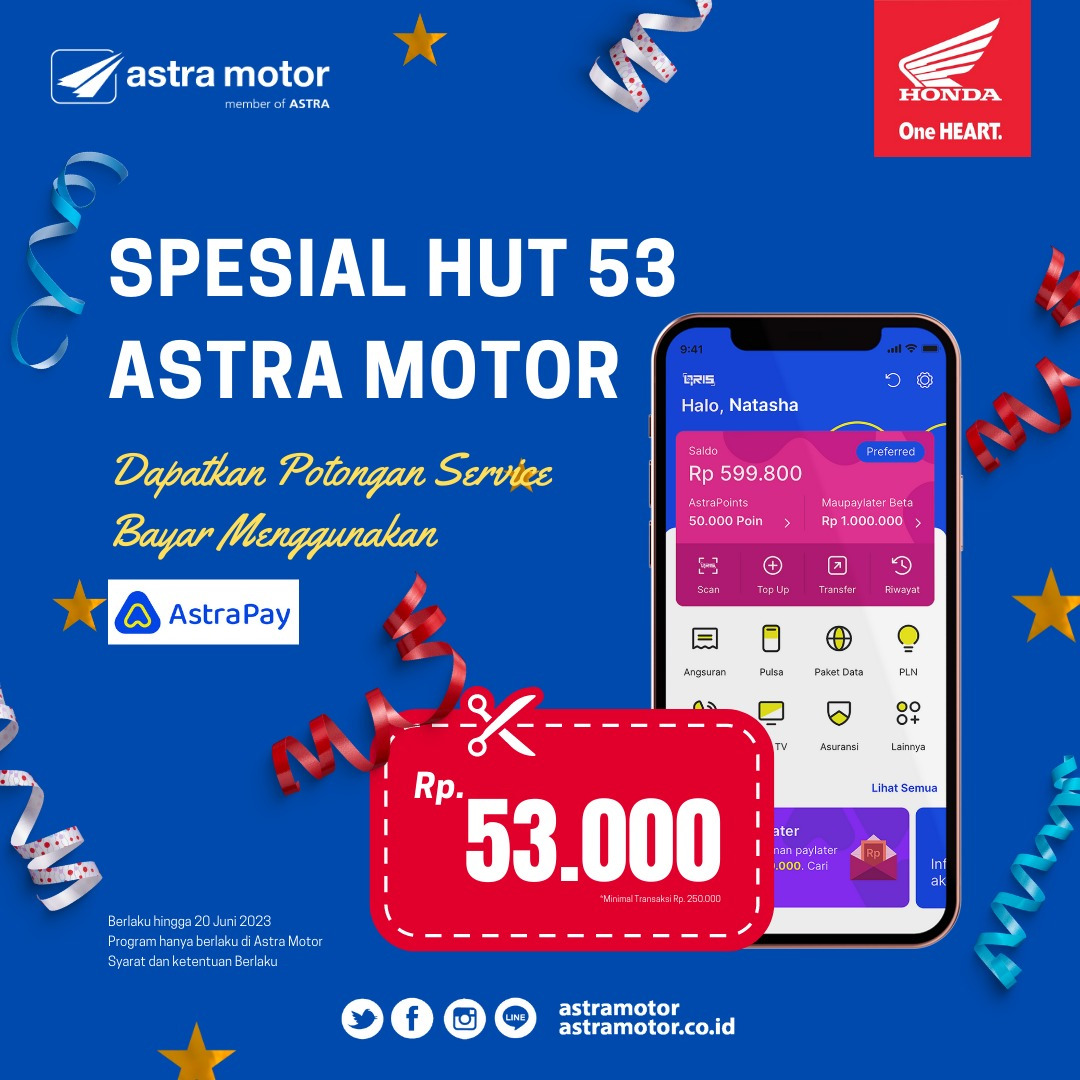 Servis motor special HUT Astra dapat diskon jasa 53000. Program ini spesial diberikan untuk merayakan HUT Astra motor yang ke 53. Ritel Astra motor memberikan beberapa program untuk memanjakan konsumen pengguna sepeda motor Honda potongan diskon servis sebesar 53.000 untuk pembayaran via aplikasi dompet digital Astrapay periode promosi ini berlaku pada 14 hingga 20 Juni 2023. Potongan tenor lima kali plus angsuran 30.000 untuk pembelian motor baru secara kredit dan harga spesial untuk pembelian cash.