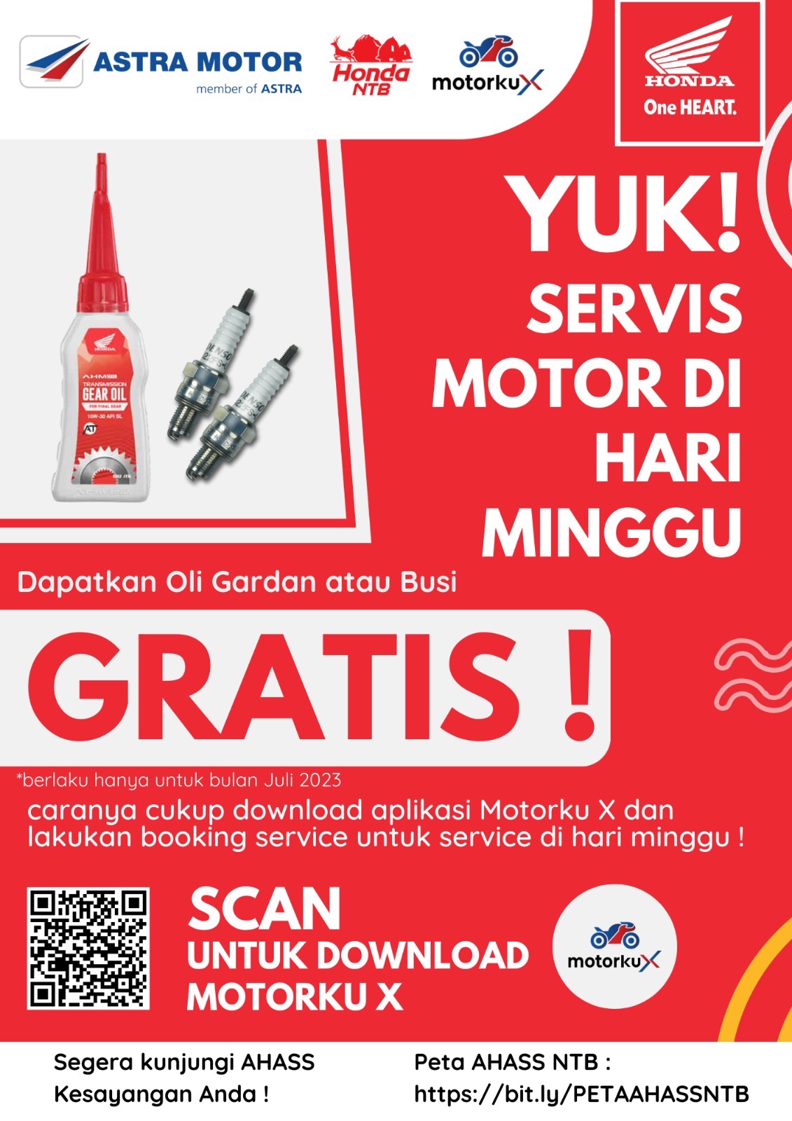 Dikatakan oleh Dicky Maulana Akbar selaku Technical Servis Manajer Astra Motor NTB, program aplikasi motorku X di bulan Juli ini memberikan gratis oli gardan bagi konsumen yang melakukan booking service pada hari Minggu.