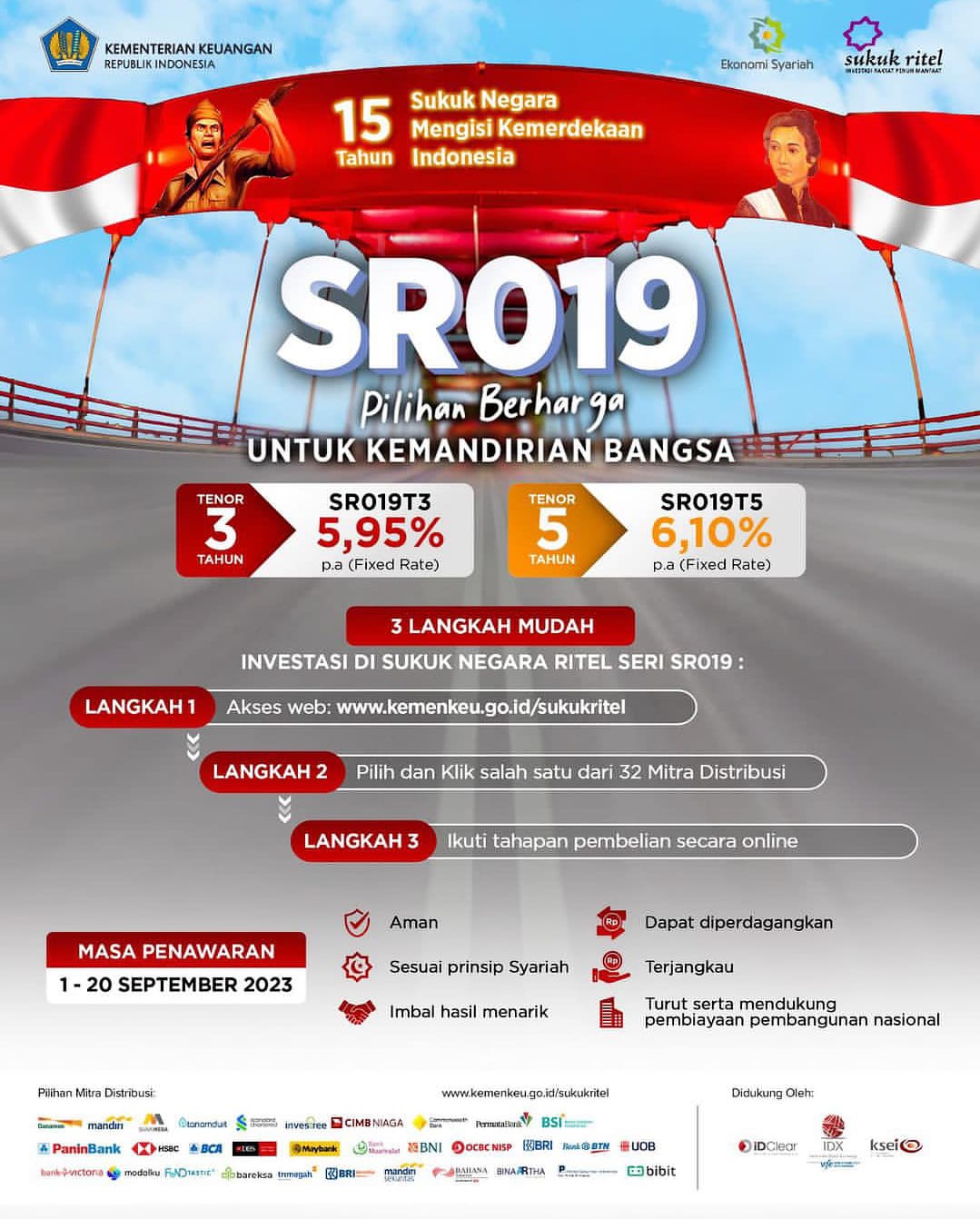 Penerbitan sukuk negara sesaui dengan prinsip syariah dan mendapatkan opini syariah dari DSN-MUI, Imbalan tetap (5,95 % untuk seri SR019T3 dan 6,10% untuk seri SR019T5) per tahun, kompetitif, potensi capital gain di pasar sekunder dan pajak (10%) lebih rendah dari pajak deposito (20%). Dijamin oleh UU APBN dan UU SBSN. Pembelian dilakukan secara online dengan minimum 1 juta, Jangka waktu investasi 3 tahun dan 5 tahun sesuai dengan kebutuhan perencanaan keuangan dan dapat dijual sebelum jatuh tempo, Hasil penerbitan digunakan untuk pembiayaan infrastruktur dan Pembangunan.