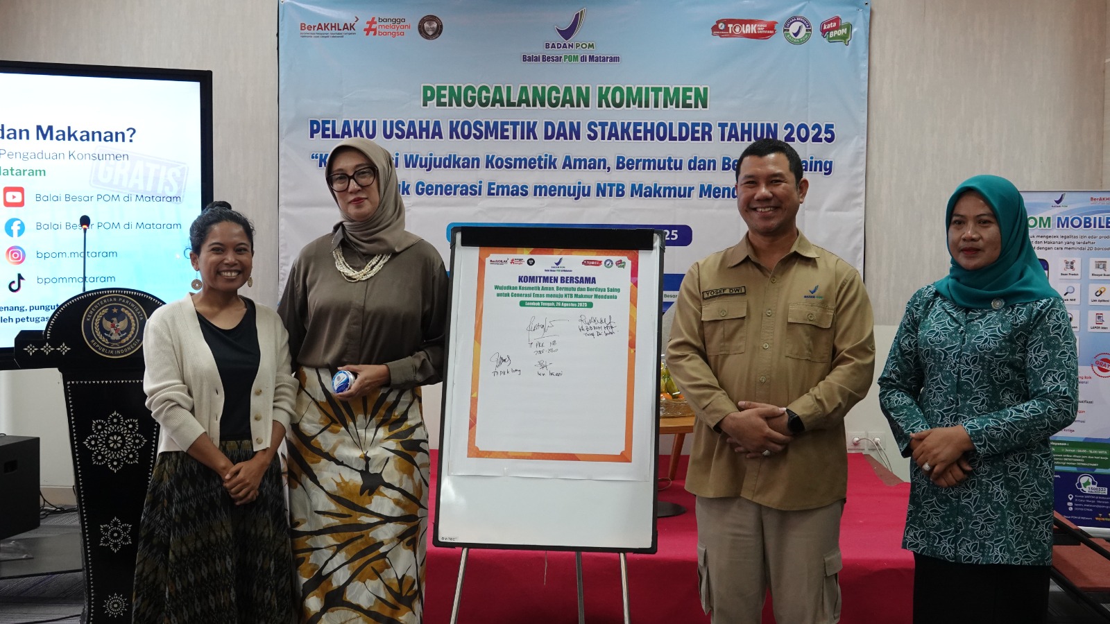 Dalam rangka meningkatkan pengetahuan dan kesadaran pelaku usaha tentang kewajiban pemenuhan aspek mutu, keamanan dan kemanfaatan kosmetik yang diproduksi dan atau diedarkan, pada 26 Agustus 2025 Balai Besar POM di Mataram menyelenggarakan kegiatan Penggalangan Komitmen Pelaku Usaha Kosmetik di wilayah Kabupaten Lombok Tengah. Kegiatan diikuti oleh 50 peserta yang merupakan pelaku usaha yang meperdagangkan kosmetik baik secara konvesional ataupun yang secara online serta kader TP PKK. Tema kegiatan penggalangan adalah Kolaborasi Mewujudkan Kosmetik yang Aman, Bermutu, dan Berdaya Saing Untuk Melindungi Generasi Emas Menuju NTB Makmur Mendunia. Hadir dalam kegiatan ini Ketua TP PKK Provinsi NTB Bunda Sinta M Iqbal dan Ketua I TP PKK Kabupaten Lombok Tengah Bunda Winarsih Nursiah